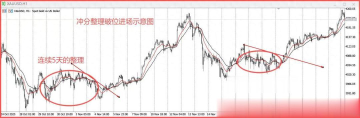 (1)1小时级别k线,经过4-5天的震荡整理(整理周期足够长)。